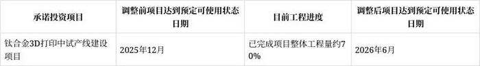 公告指出,“钛合金3D打印中试产线建设项目”延期主要因实施过程中面临两大挑战:一是自研设备技术难度超出预期,二是厂房改建施工复杂程度较高,导致项目实际进度滞后于原计划。